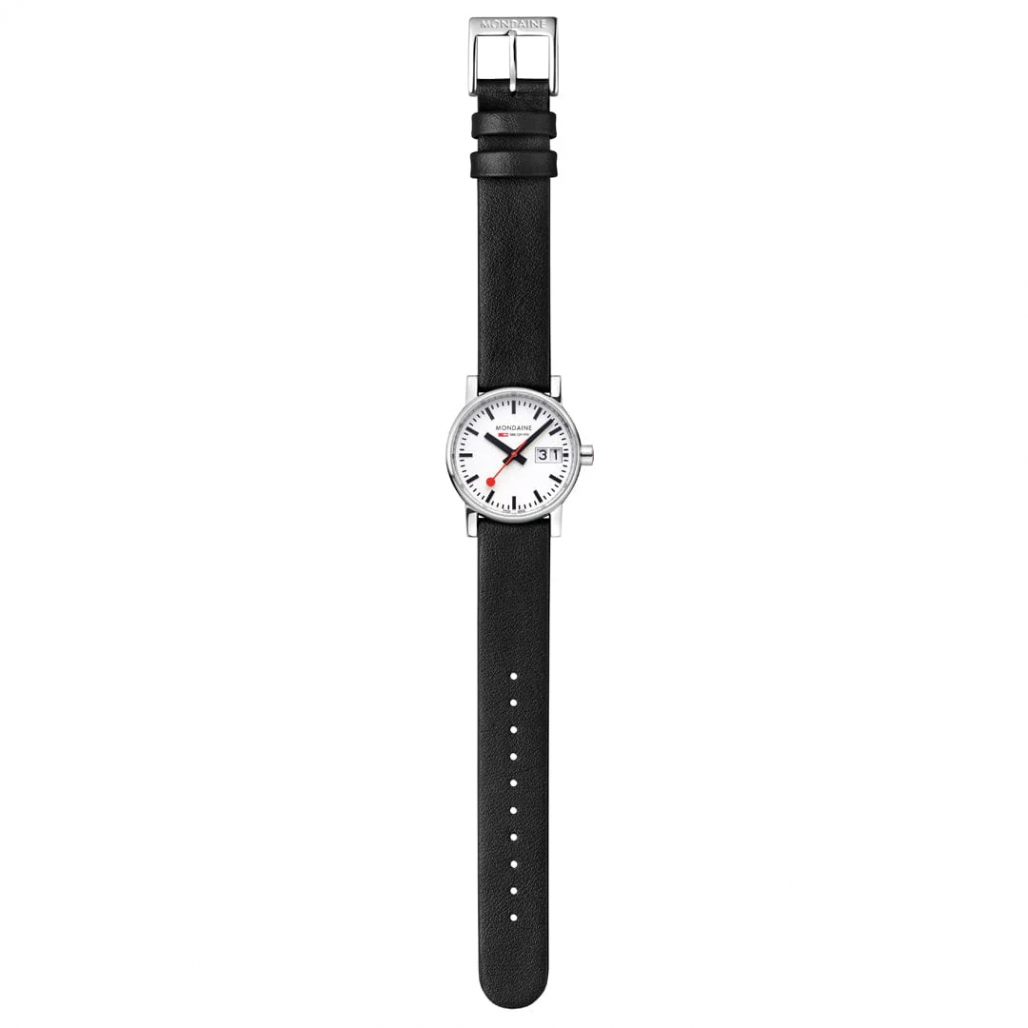 Det harmonisk formede urkasse af poleret rustfrit stål på Mondaine Official Swiss Railways evo2 lover maksimal bærekomfort. Det ikoniske design på dette klassiske ur kendetegnes ved den letlæselige urskive, som afrundes af den store datovisning. Uret har en sort vegansk læderrem. Sidstnævnte består af 75 % plantebaseret øko-kompositmateriale og 25 % genanvendt PET.