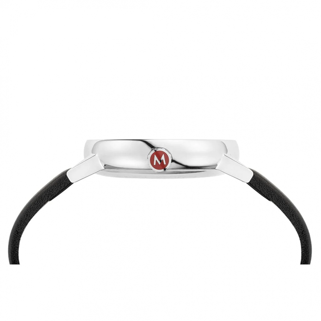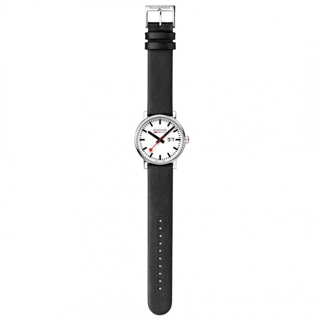 Den harmonisk formede urkasse af poleret rustfrit stål på Mondaine Official Swiss Railways evo2 lover maksimal bærekomfort. Det ikoniske design på dette klassiske ur kendetegnes af den letlæselige urskive, som afrundes af den store datovisning. Uret har en sort vegansk læderrem. Sidstnævnte består af 75 % plantebaseret øko-kompositmateriale og 25 % genanvendt PET.