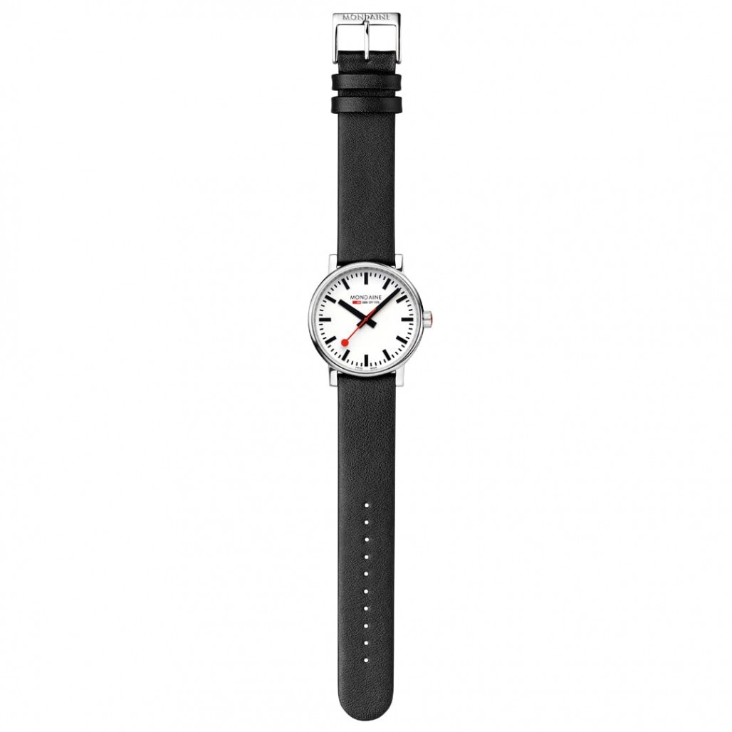 Den harmonisk formede urkasse på Mondaine Official Swiss Railways evo2 er fremstillet af poleret rustfrit stål og tilbyder maksimal komfort. Det klassiske ur kendetegnes af den letlæselige 40 mm urskive, som beskyttes af et ridsefast safirglas. Den ergonomiske røde krone og den elegante sorte veganske læderrem fuldender designet.