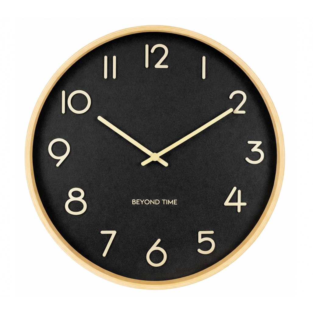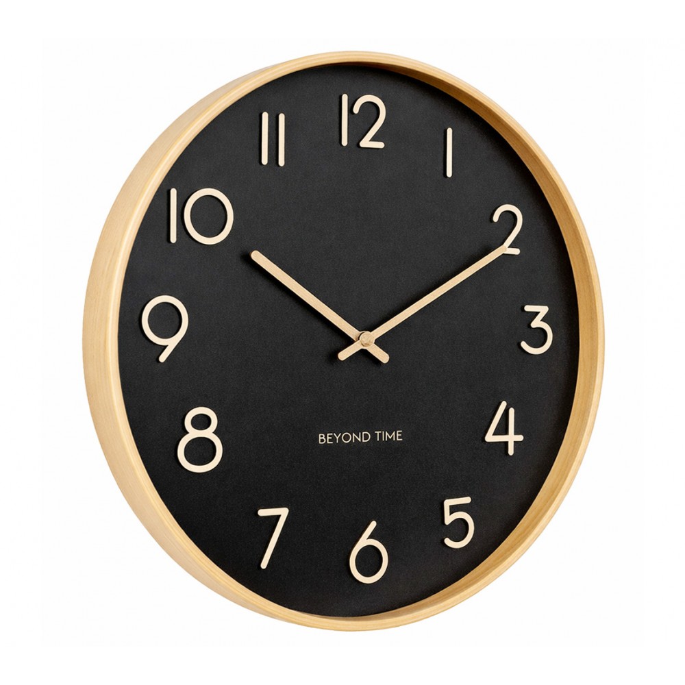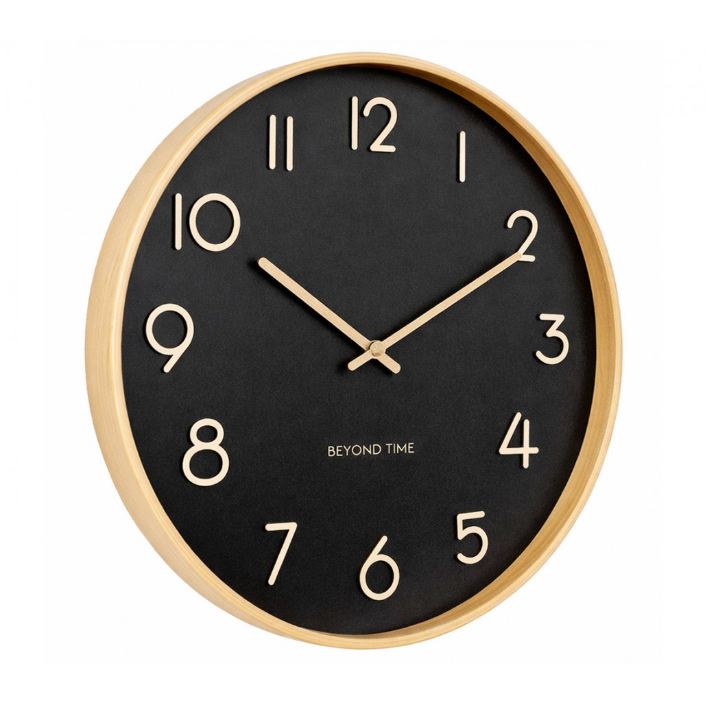 Et stort og stilfuldt vægur lavet af lyst træ med sort urskive. Det har et lydløst urværk der ikke tikker.